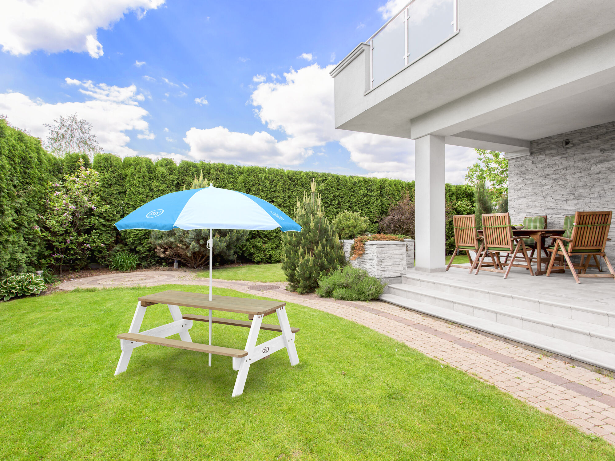 Let your children sit comfortably on the Nick Picnic Table Brown/White from AXI. When the sun starts to shine, they can look for shelter under the height-adjustable umbrella. With its neutral brown/white colours, this modern coloured Picnic table fits perfectly in any interior or garden. There is enough space at the picnic table to sit with four children at the same time. In this way they can craft, draw or enjoy some goodies together. Suitable for children from 3 to 10 years old.