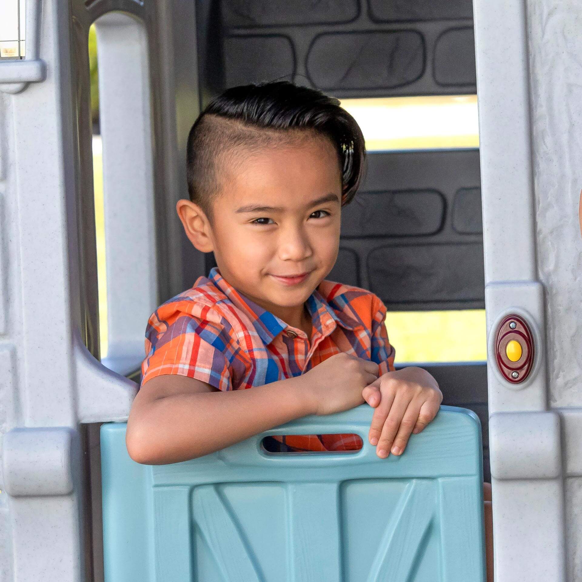 The Enchanting Adventures 2-Story Playhouse & Slide™ is the perfect backdrop for any adventure your little one dreams up. Their next enchanting adventure awaits with two stories for engaging social play, tons of storytelling, and pretend playtime fun with friends! From the indoor kitchenette to the top platform, slide, and more -- there’s something fun for everyone to do and so many pretend play opportunities in this charming kids playhouse. There’s a real working doorbell to let friends know it’s time to play and an inviting Dutch-style door that opens into the indoor kitchenette space with pretend oven, sink with faucet, and cooktop area to get cooking! Climb the built-in ladder to continue the fun outside on the top platform, complete with a quick getaway opportunity with the extra-long slide! Real working shutters along with the faux woodwork and stone accents add a charming storybook cottage look to this outdoor playhouse for toddlers.